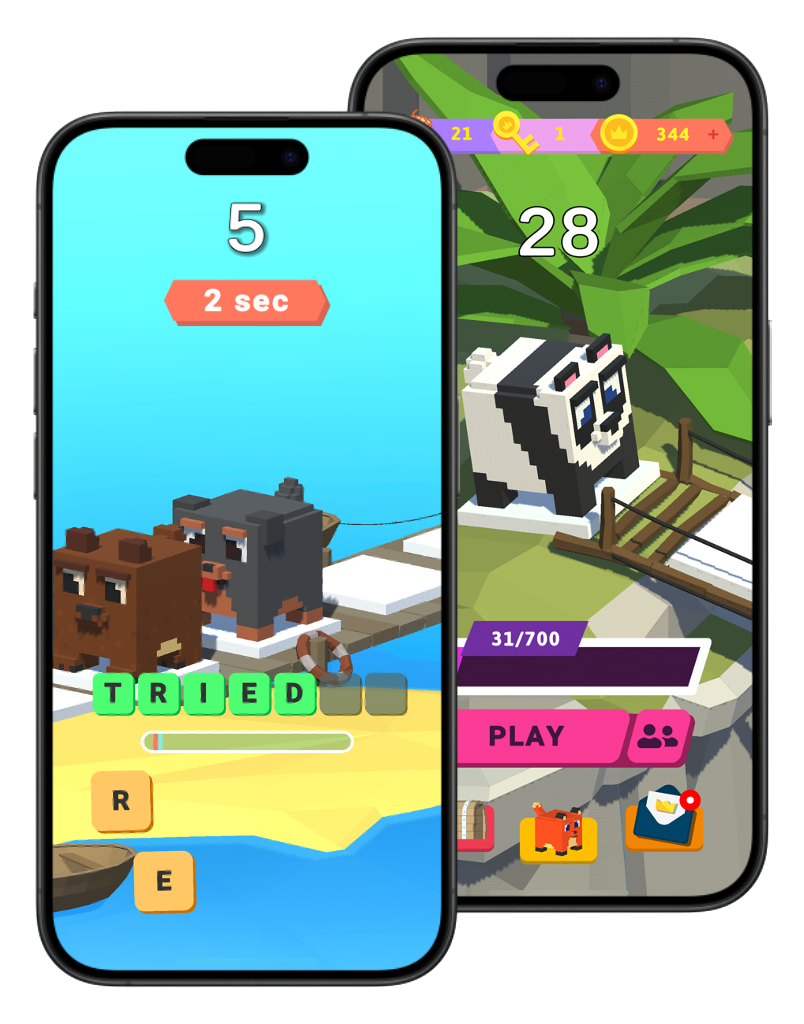 Challenge your friends and show off your word skills in a head-to-head battle. You're given 7 letters and 9 seconds to form the longest word possible. Reach new levels and areas to unlock and play as your favourite animals.